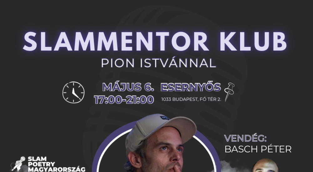 Slammentor KlubMÁJUS 06. | SZERDA 17:00-21:00 Helyszín: Szindbád rendezvényterem SLAMMENTOR KLUB Slam poetry mentorprogram az Esernyősben 2026 márciusától új közösségi esemény-sorozat indul az Esernyős és a Slam Poetry Magyarország Egyesület közös szervezésében. A havonta megrendezett mentorprogram kezdő és haladó slammerek számára kínál nyitott alkotói teret. A program vezetője Pion István költő, slammer, aki minden alkalommal egy […]